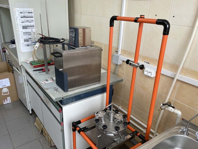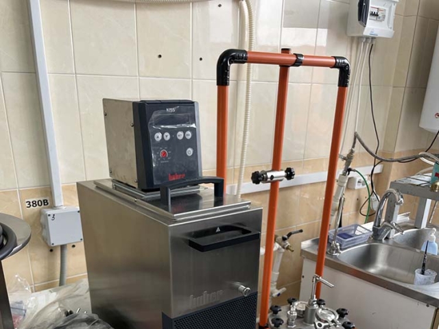 Для того чтобы нагреть и охладить емкость, реакторную систему мы укомплектовали высокоточным жидкостным термостатом немецкой компании Peter Huber модели KISS K6.