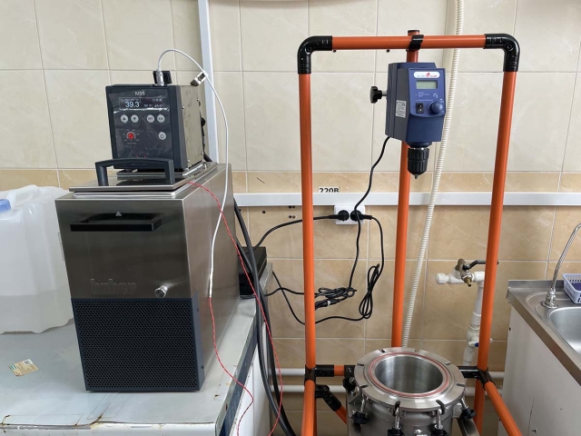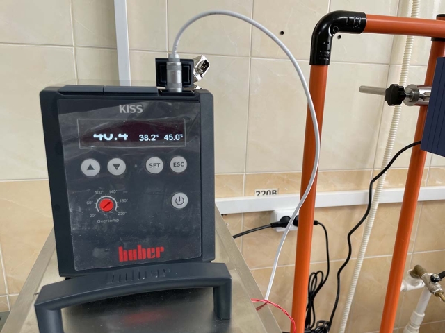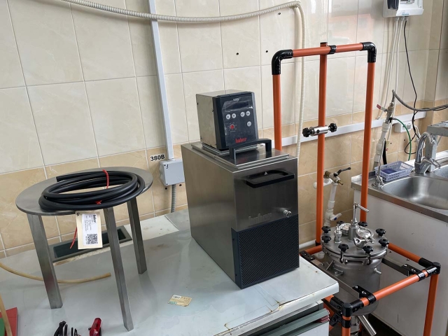 Для того чтобы нагреть и охладить емкость, реакторную систему мы укомплектовали высокоточным жидкостным термостатом немецкой компании Peter Huber модели KISS K6.