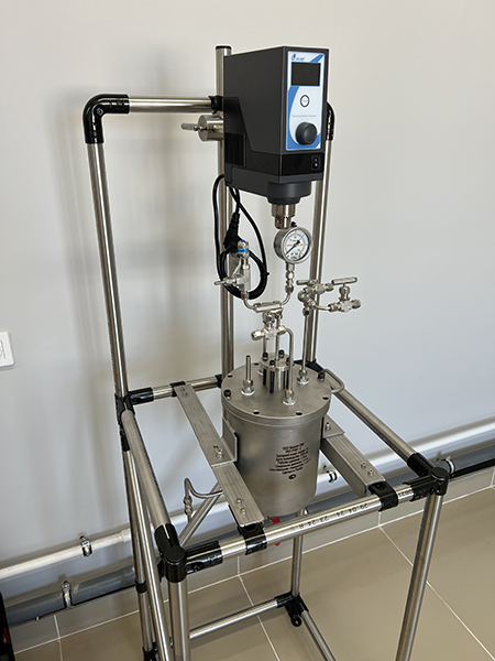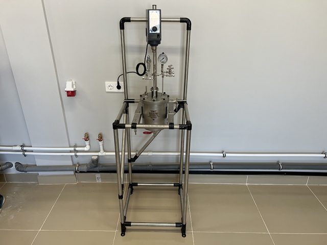 Реактор, его обвязка и мешалка размещены на виброустойчивом стенде нашего производства, сделанном из нержавеющей стали.